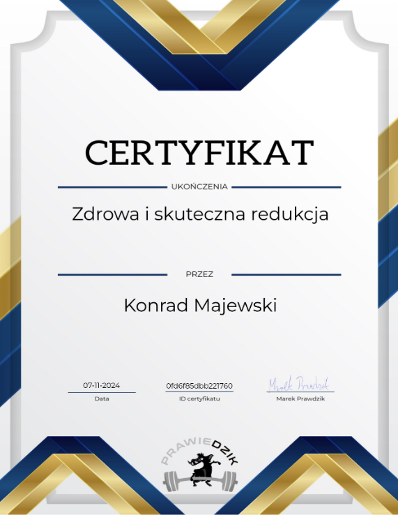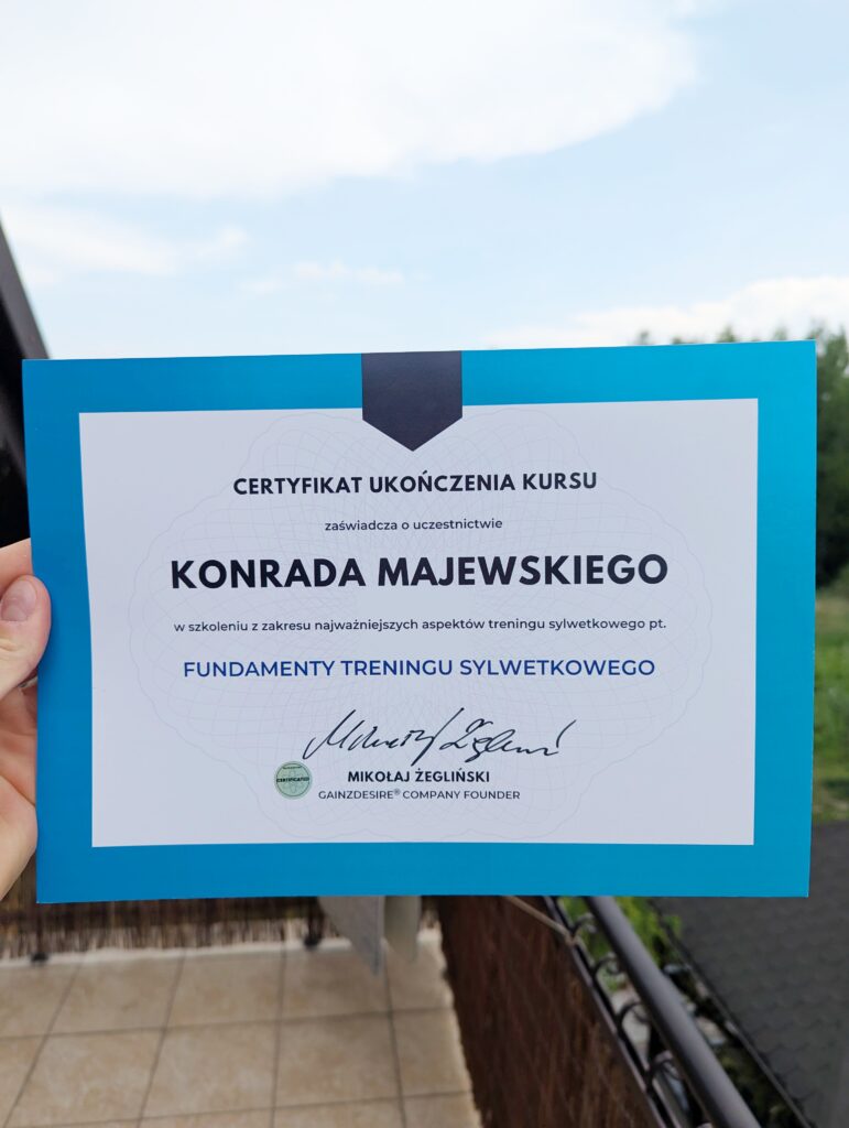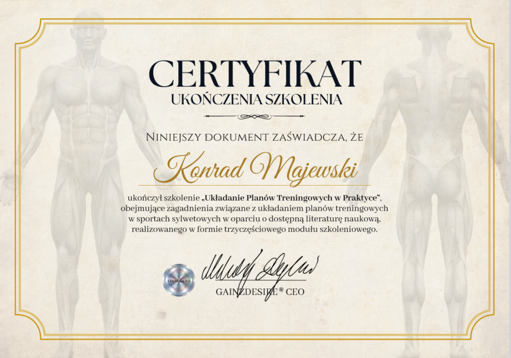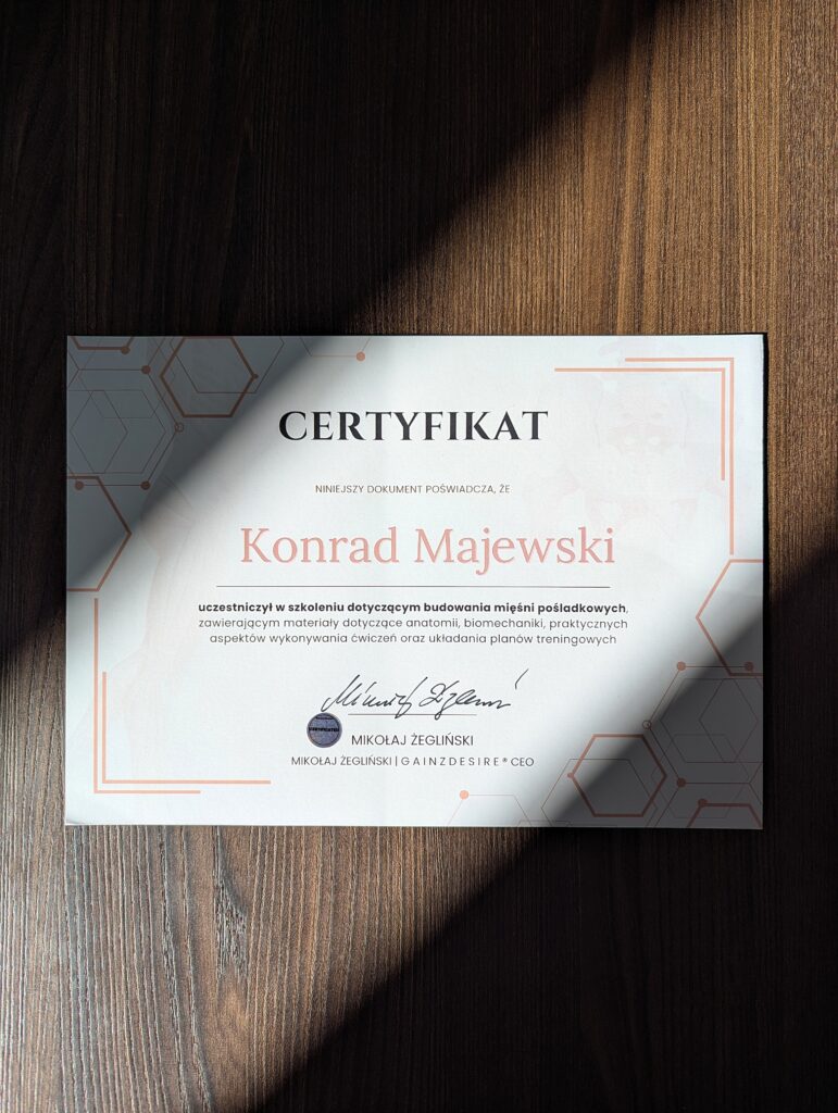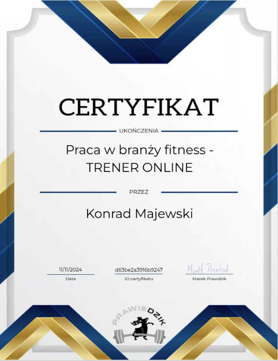 Układając plan nie zgaduję - pracuję na sprawdzonych metodach i rzetelnej wiedzy. Dzięki certyfikatom i nieustannemu szkoleniu mogę prowadzić Cię bezpiecznie i skutecznie, niezależnie od Twojego poziomu.