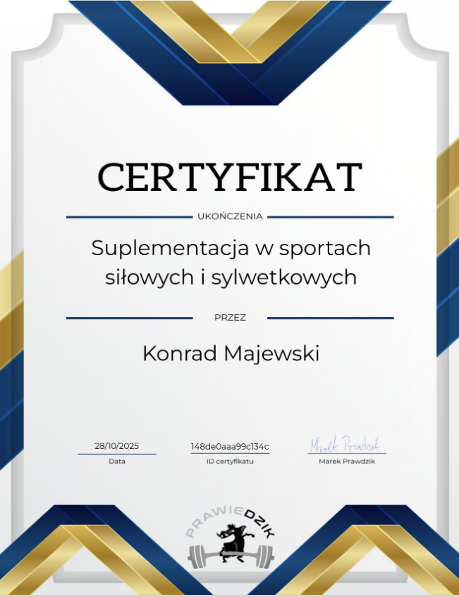 Indywidualnie dobrana suplementacja to zestaw suplementów dopasowany dokładnie do Twoich potrzeb, celów i stylu życia. Analizuję Twój tryb dnia, wyniki, intensywność treningów oraz ewentualne braki w diecie, a następnie proponuję tylko to, co naprawdę może zrobić różnicę. Moje rekomendacje opieram na aktualnej wiedzy zdobytej podczas specjalistycznych kursów i szkoleń z zakresu dietetyki oraz suplementacji.
